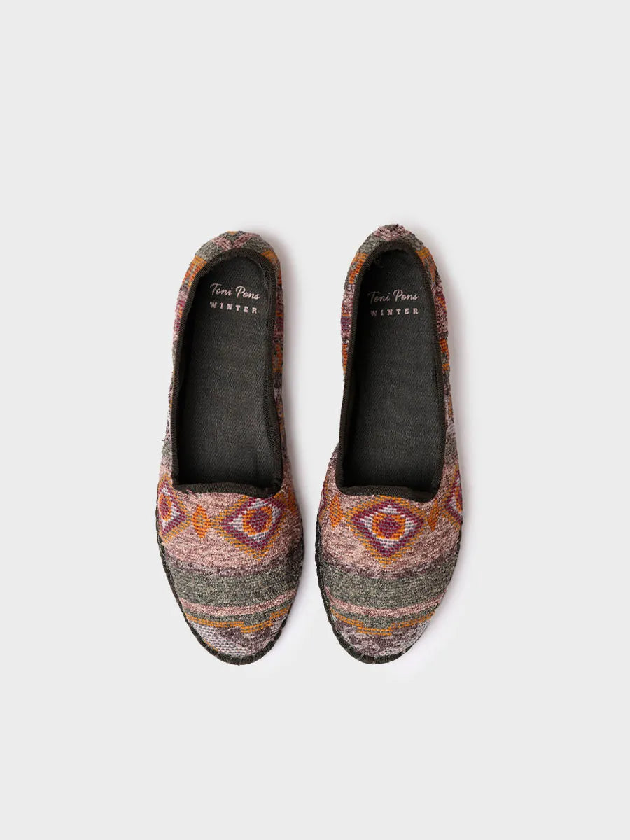 CECILIA. Aquesta ballarina per a dona s'elabora en teixit estampat amb un rivet contrastat. El folre i la plantilla interior són de cotó. Es tracta d'un model pla molt comfortable. La sola és de goma antilliscant.