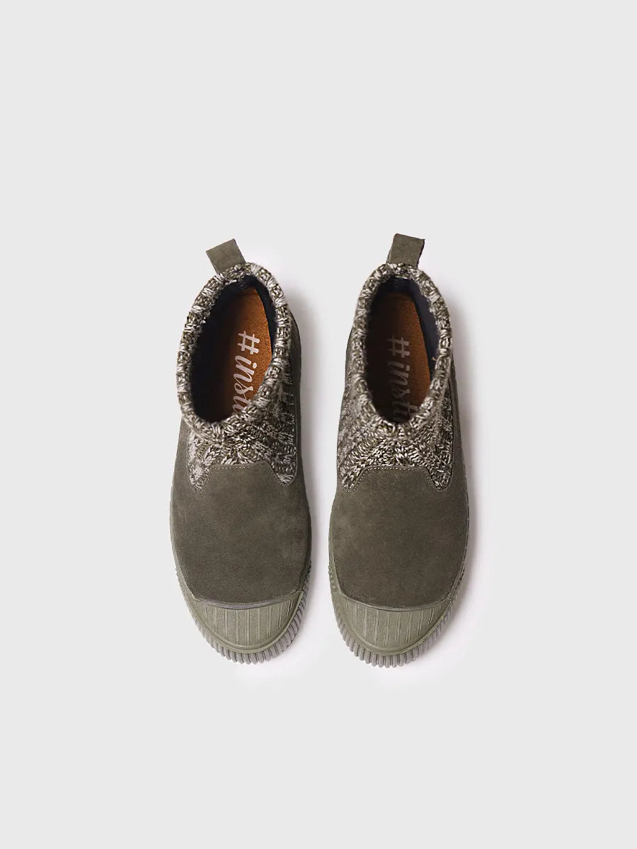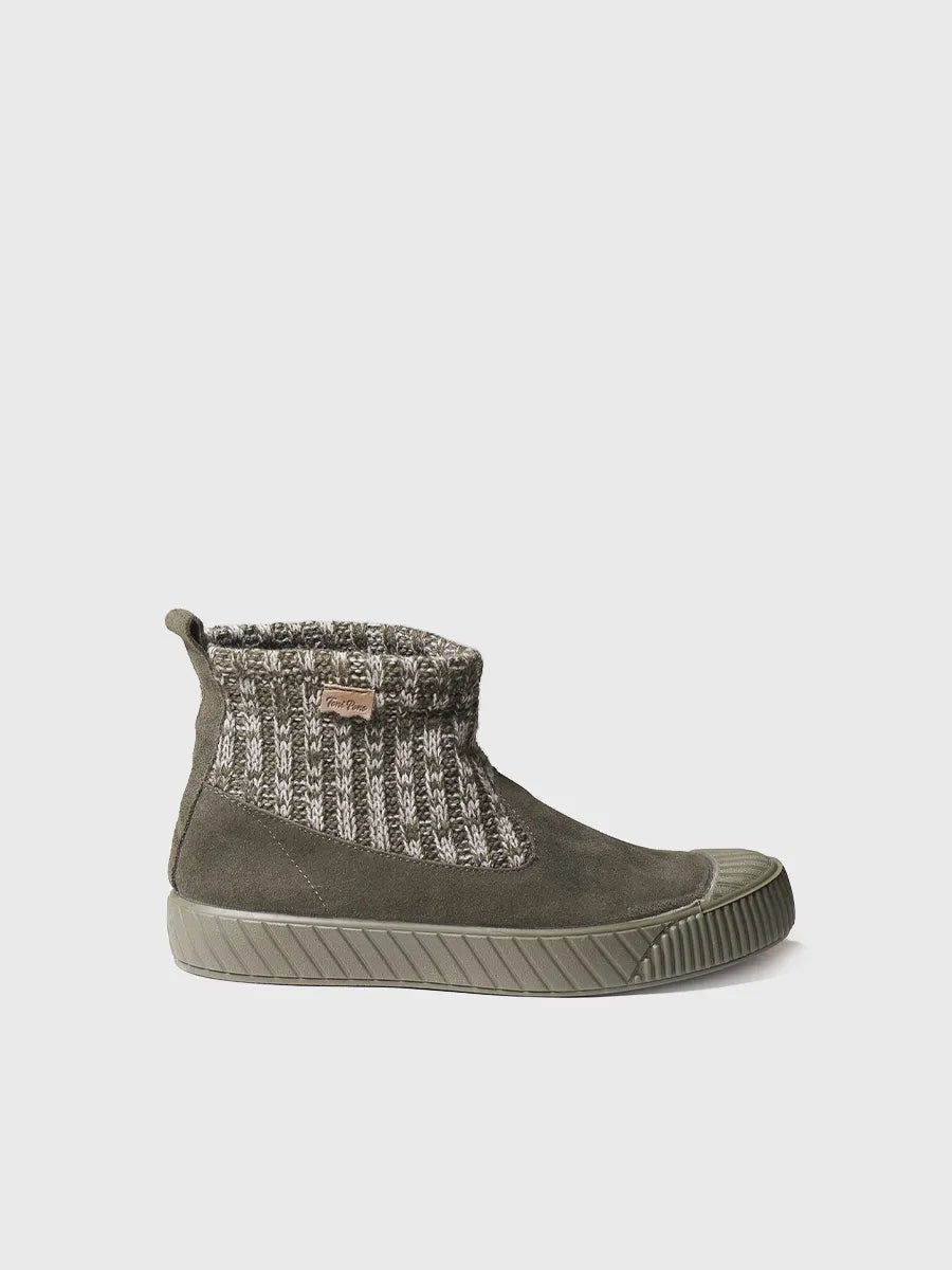 GODA-AB. Aquest botí per a dona s' elabora en serratge i teixit en tons llisos. La sola és plana, té 3 cm de gruix i està feta de goma al to, igual que la puntera. La base de la sola és de goma antilliscant. La plantilla interior és extraïble i està folrada en teixit transpirable per a més comoditat.