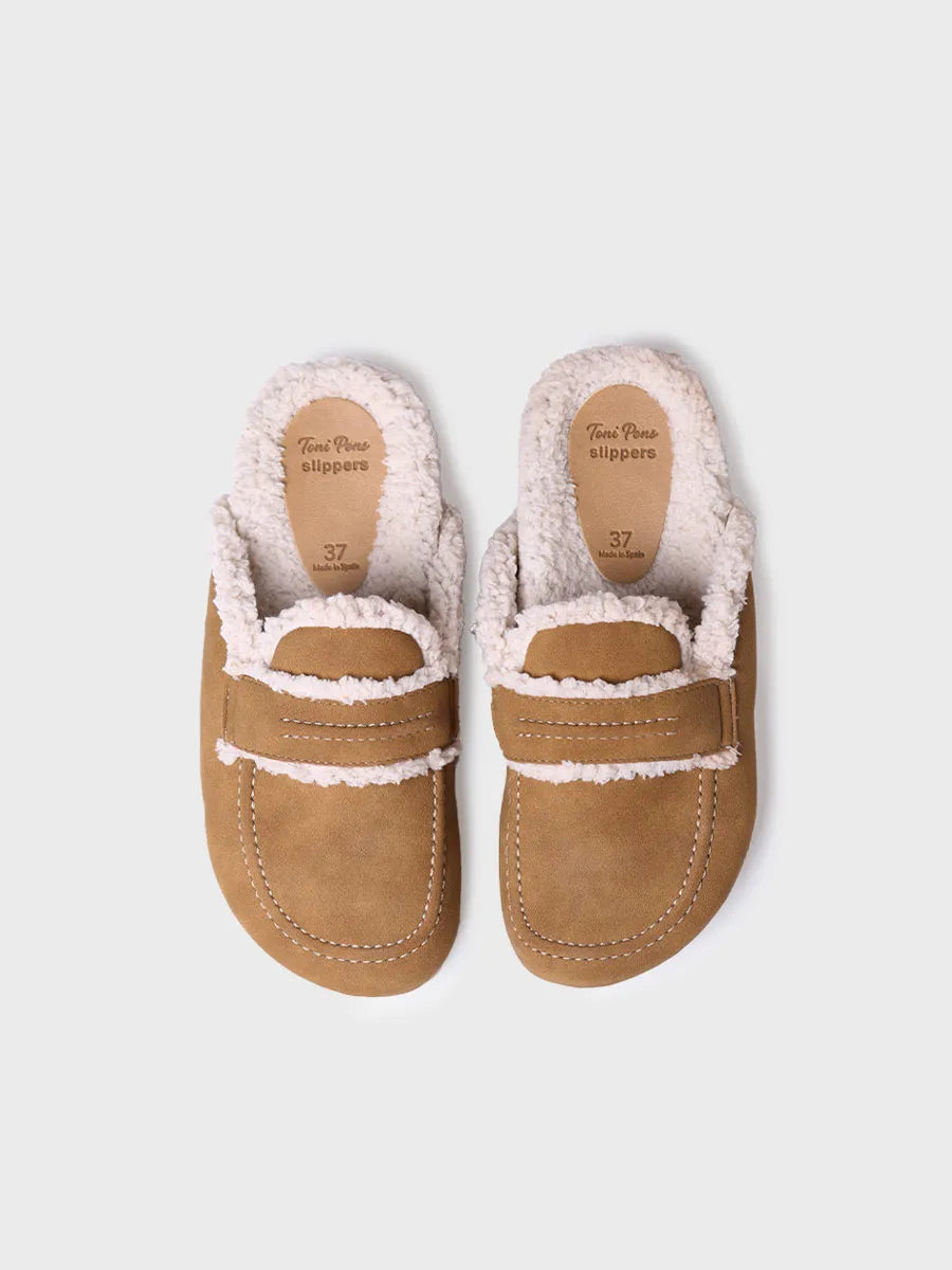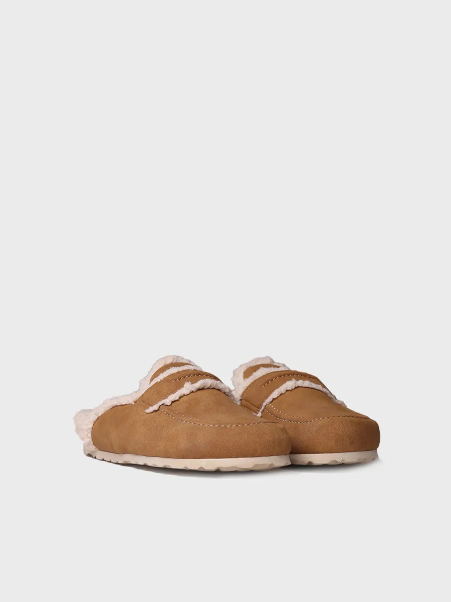 LEIRE. Dieser Hausschuh für Damen ist ein offenes Modell aus synthetischem Gewebe, das Spaltleder simuliert. Es handelt sich um ein Bio-Design, das mit Schaffell gefüttert ist. Die Sohle besteht aus rutschfestem EVA-Gummi und hat eine Gesamthöhe von 2,5 cm.