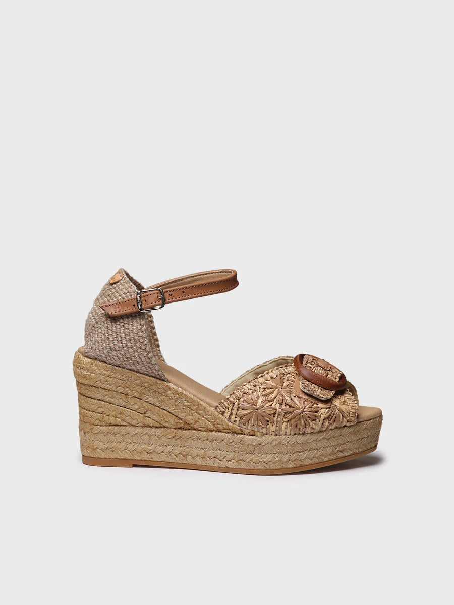 LIA-RF. This wedge espadrille is crafted in two-tone raffia and features a decorative buckle on the upper. It includes an ankle strap with a buckle fastening that ensures optimal support. The jute wedge has a total height of 7.5 cm, with a 4.5 cm heel and a 2.5 cm platform. The outsole is made of non-slip rubber, and the padded insole provides extra comfort. This design is hand-stitched in Spain. This style fits true to size; if you are between sizes, we recommend choosing the larger one.