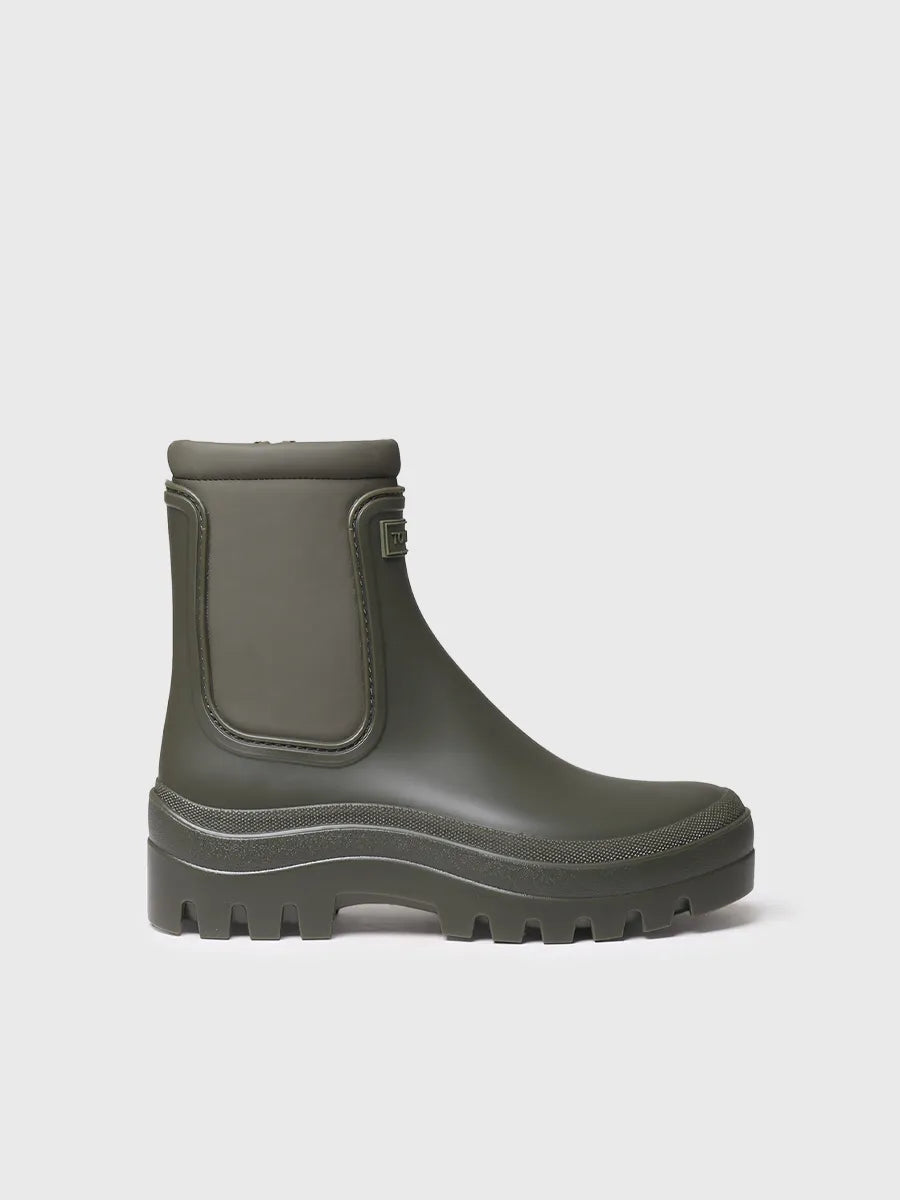 CASCAIS. This women's rain boot is made of neoprene-effect fabric and monochromatic rubber. It is a reinvention of the classic Chelsea boot in a waterproof version. It has a platform sole with a wavy design and a height of 5 cm. The base of the sole is made of non-slip rubber. The inner insole is lined with fabric for added comfort. It features a side zipper for easy on and off.