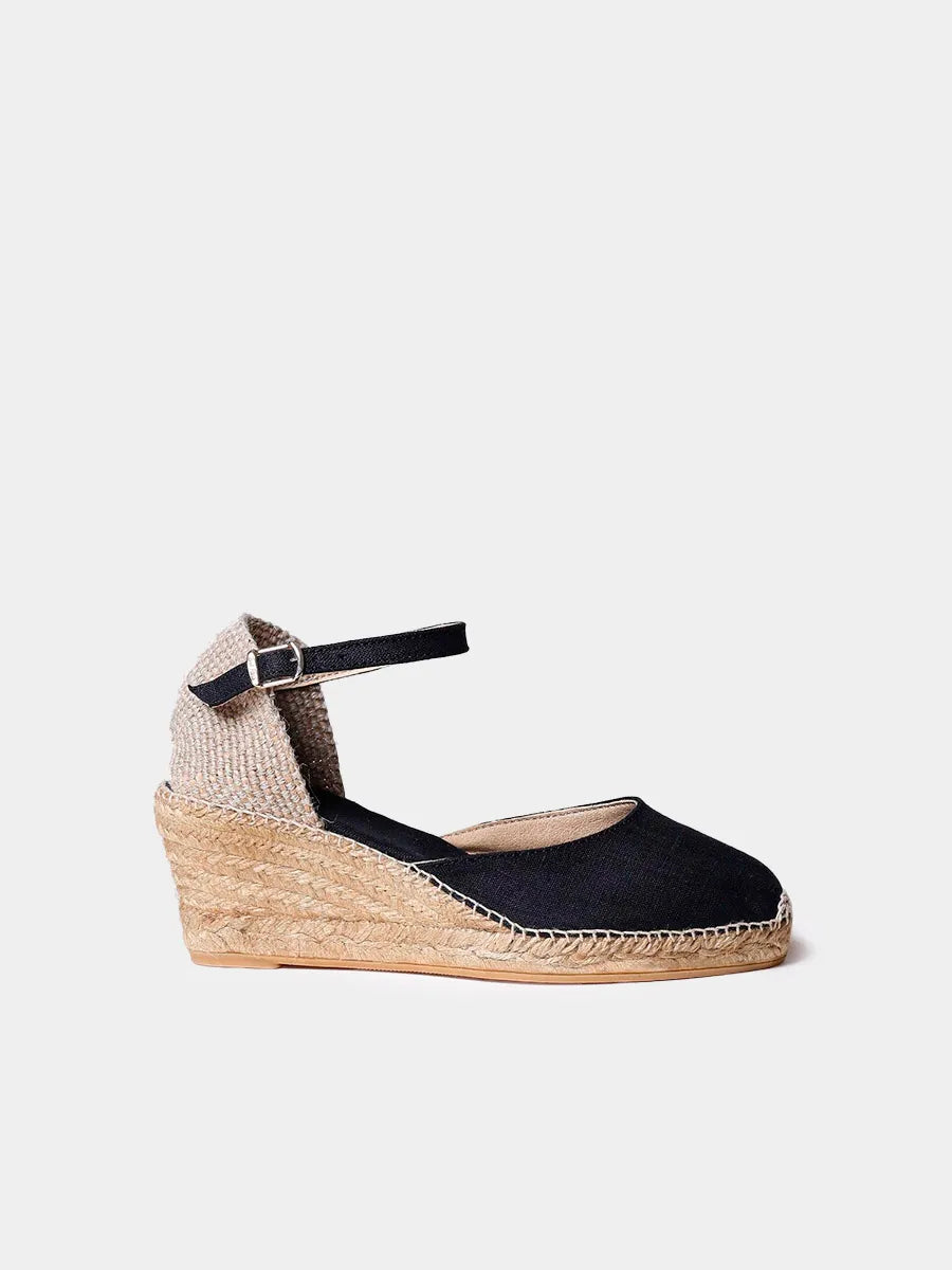 CALDES. This wedge espadrille with buckle fastening in plain colours has a total height of 7 cm, of which 5 cm belong to the heel and 2 cm to the platform. The entire wedge is made of jute, and the inner sole is lined with fabric. The fabric and sole are hand-stitched with cotton thread and have a reinforced toe. The base of the sole is made of non-slip rubber. This espadrille is 100% vegan, made from materials that do not come from animal origin. This model fits true to size; if you are between two, we recommend choosing the larger size.