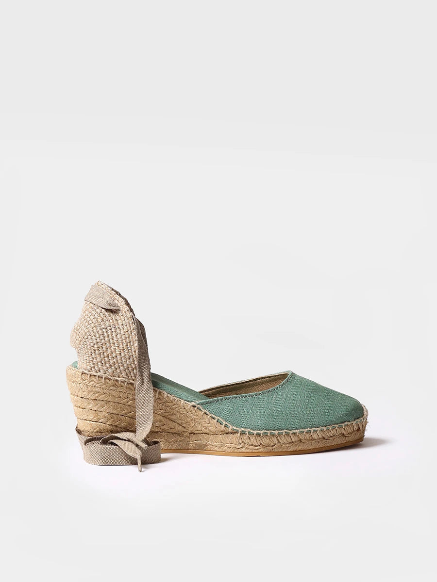 CALONGE is the classic Valencian wedge espadrille with straps and is made in solid tones. The jute wedge has a total height of 7 cm, of which 5 cm belong to the heel and 2 cm to the sole. This design is hand-sewn in Spain. The base of the sole is made of non-slip rubber. It is a 100% vegan espadrille.