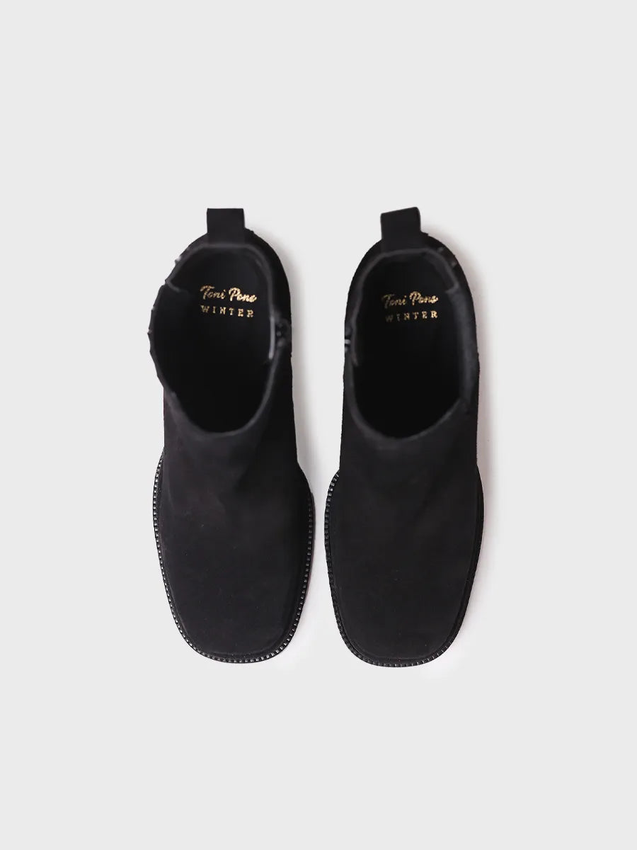 ROS-SY. This women's wide-heeled ankle boot is crafted in split leather. The heel has a total height of 8 cm. The sole is made of non-slip rubber. It has a rear puller and a zipper for easy placement. The inner insole is lined in breathable fabric.