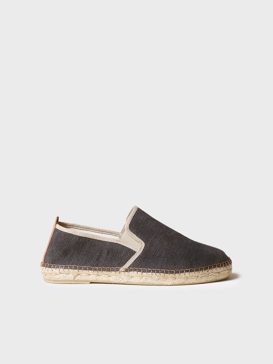 DALLAS. Espadrilla da uomo in tessuto a tinta unita. La suola esterna è in iuta. La base della suola è di gomma antiscivolo e la suola interna è foderata in tessuto. Questo modello è cucito a mano in Spagna. Gli elastici laterali fanno sì che si adatti perfettamente al piede. Questo modello indossa la taglia comune, se sei indecisa tra due taglie ti consigliamo di scegliere la taglia più grande.