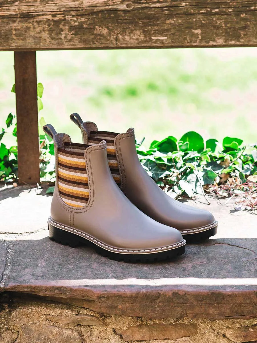 CORBIN. Stivaletti da pioggia da donna realizzati in tonalità contrastanti con strisce sui lati elastici. Sono pensati per i giorni di pioggia. Questo modello calza la misura standard, se hai una taglia intermedia, ti consigliamo di scegliere quella più grande.