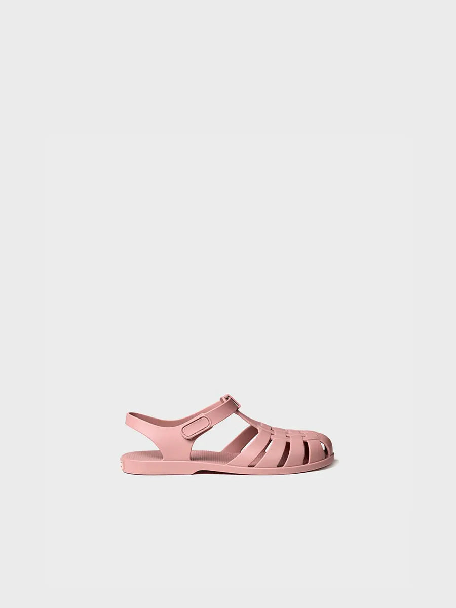CUZCO. Sandali acqua per bambini a tinta unita. È una calzatura classica con chiusura laterale regolabile in velcro. Hanno inoltre una soletta interna di gomma. Il modello è vegano al 100% e impermeabili. Questo modello indossa la taglia comune, se sei indecisa tra due taglie ti consigliamo di scegliere la taglia più piccola.