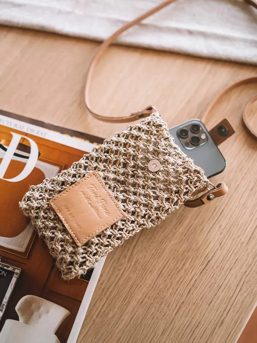 GINETH: Questa borsa portacellulare è realizzata in iuta con manico e chiusura in microfibra naturale. È un modello vegano. Misure: 11 cm x 18 cm