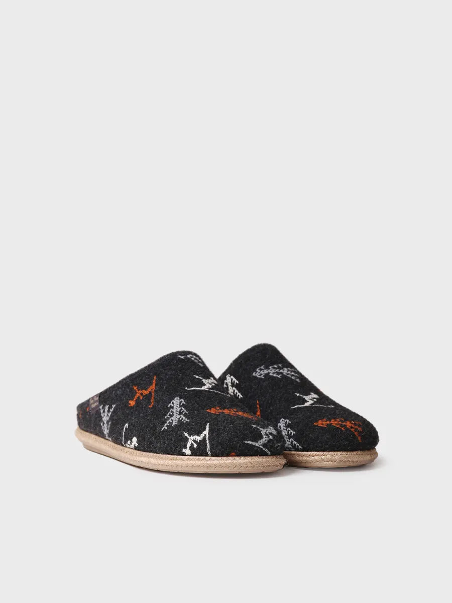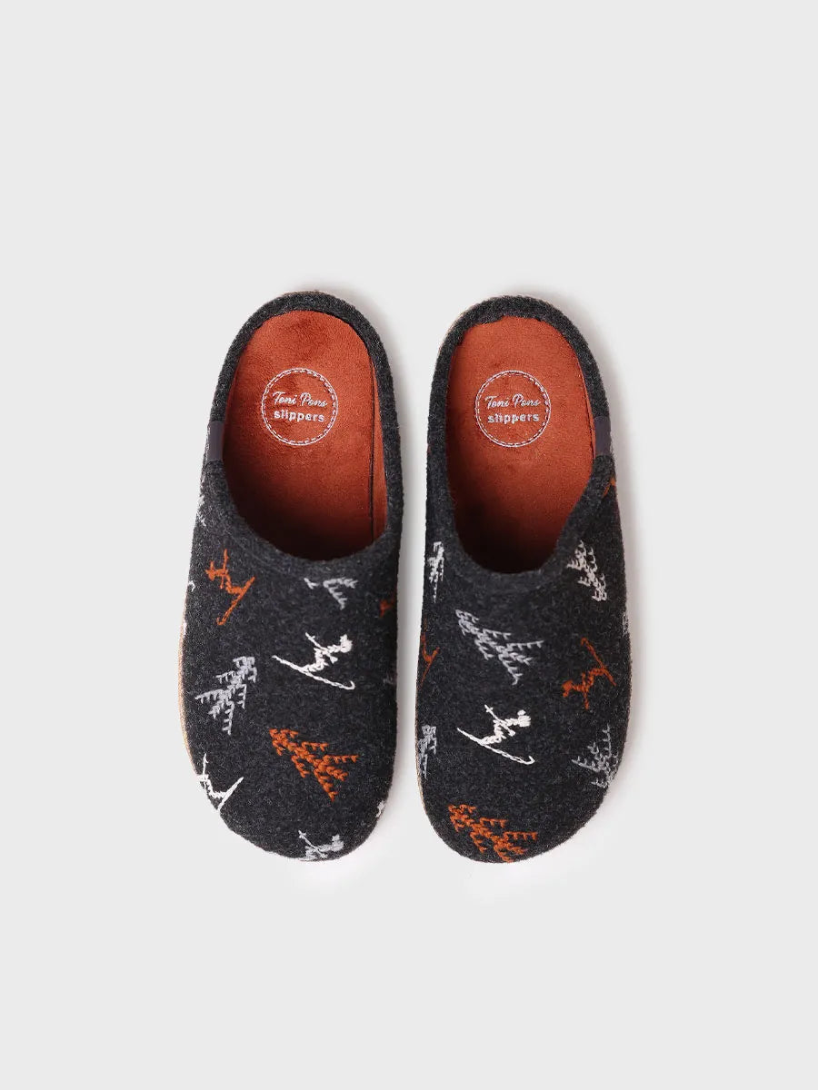 TOBI-SK. Questa pantofola da uomo è realizzata in feltro tinta unita, con un ricamo di motivi invernali. L'interno è foderato con morbida pelliccia. La suola è piatta, spessa 1 cm e realizzata in gomma antiscivolo e treccia di juta. Ha una soletta estraibile con una zeppa di 2 cm nel tallone.