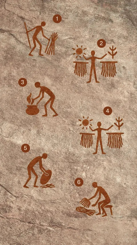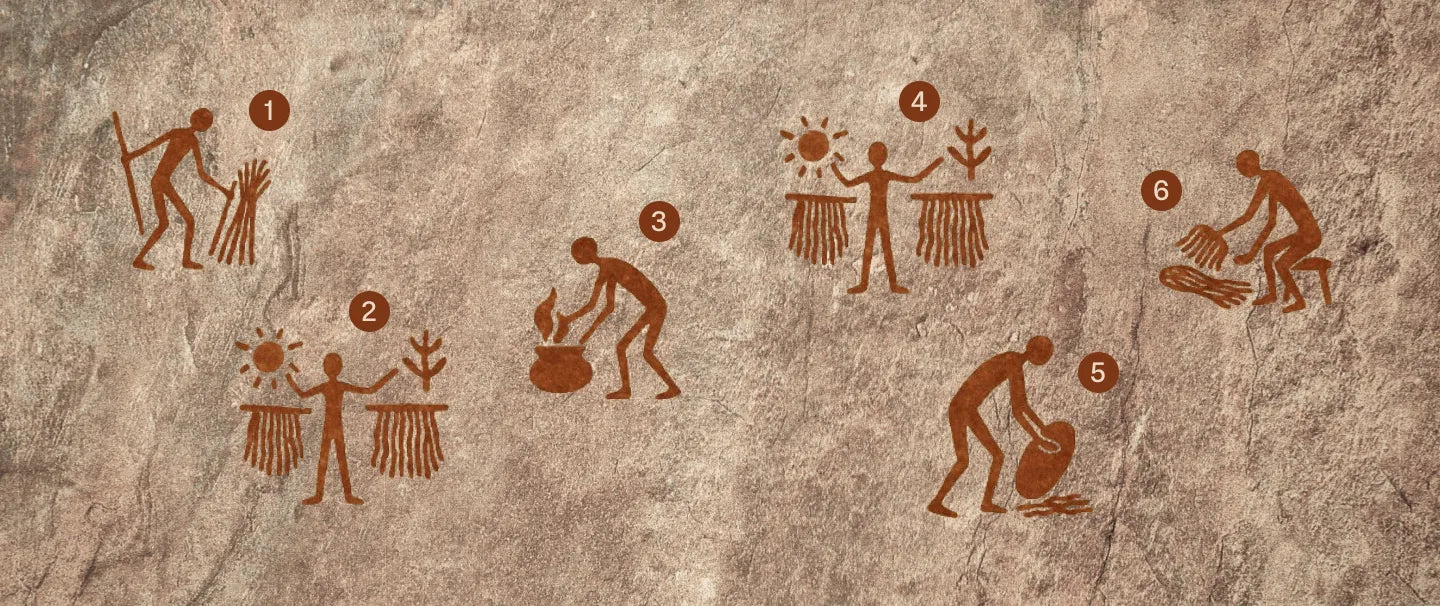 Recolección (1), Secado al sol o a la sombra (2), Cocción para ablandar las fibras (3), Segundo secado (4), Picado con piedra o tronco (5) y Manufactura (6)