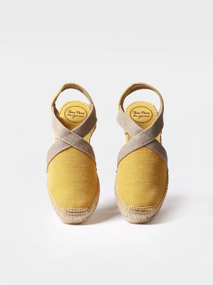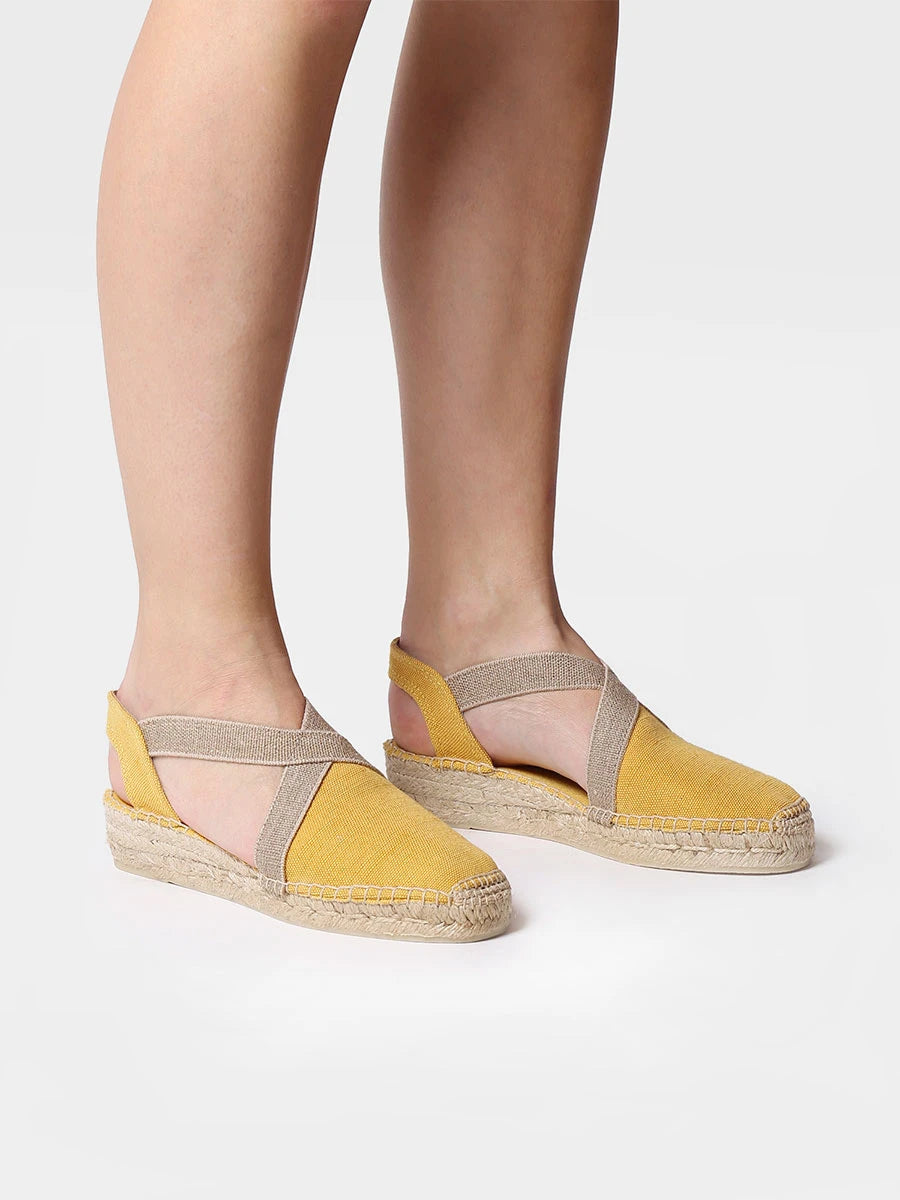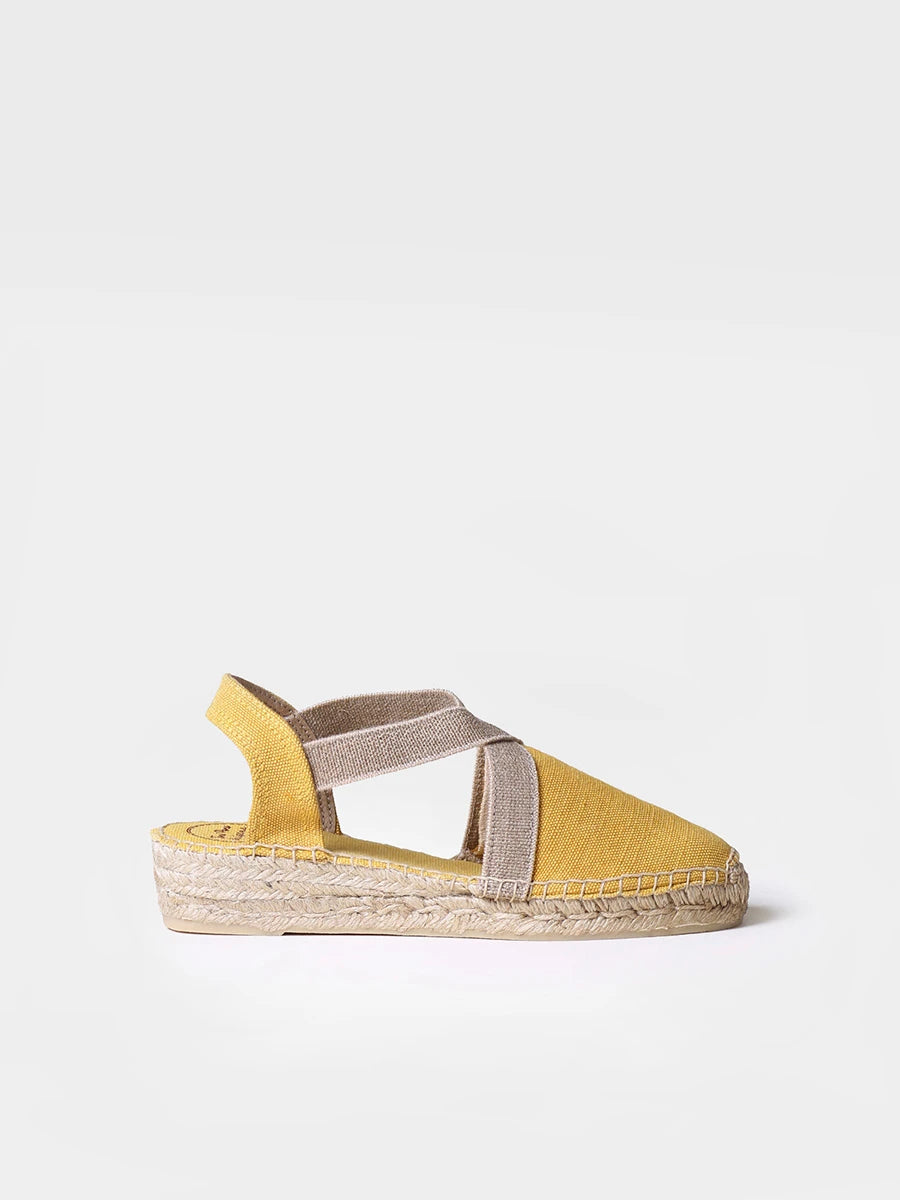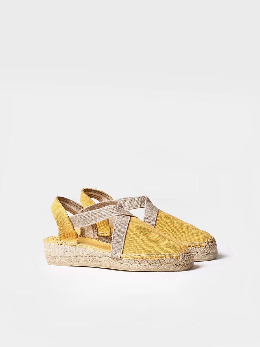 VERDI-V. Esta alpargata vegana plana para mujer se elabora en tejido de algodón en tonos lisos. La cuña de yute tiene una altura de 4 cm. La base de la suela está hecha de goma antideslizante. Cuenta con dos tiras elásticas contrastadas que dan una sujeción óptima al pie. La suela interior está forrada en tejido para mayor comodidad. Este diseño está cosido a mano en España. Es un modelo vegano.