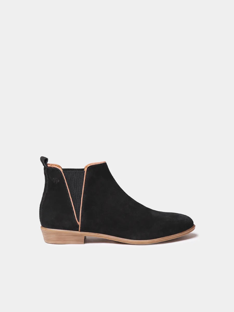 NAROA-SY. Este botín de mujer se elabora en serraje. Cuenta con elásticos laterales y un tirador en la parte posterior para facilitar su colocación. El interior del botín es de piel y tiene una plantilla acolchada y tiene una altura total de 2,5 cm.